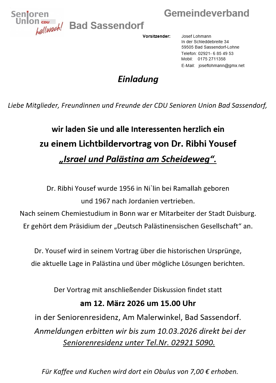 Lichtbildervortrag von Dr. Ribhi Yousef in Bad Sassendorf: „Israel und Palästina am Scheideweg“