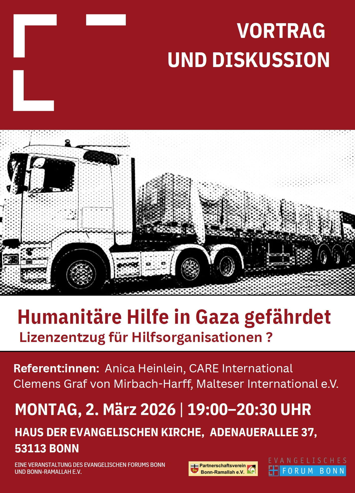 Vortrag von Anica Heinlein und Clemens Graf von Mirbach-Harff in Bonn: „Humanitäre Hilfe in Gaza gefährdet“